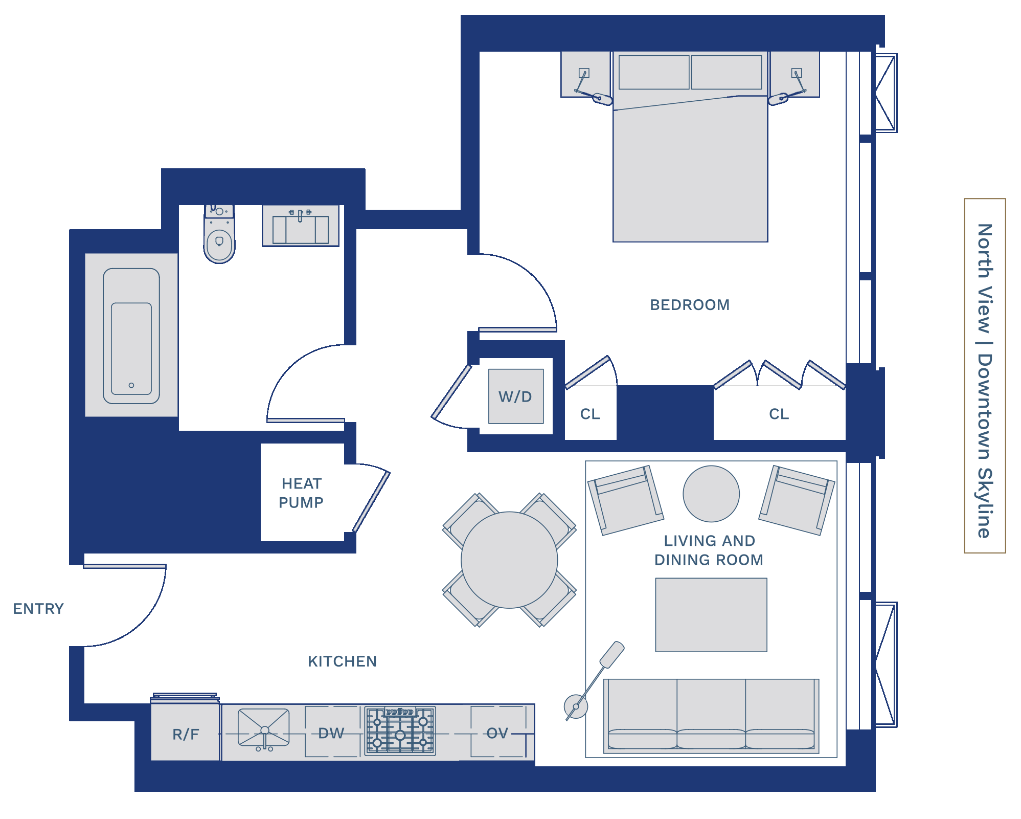 An open dining and living area offers effortless flow, creating a refined urban retreat above the city. The spa-inspired bath includes a custom-designed vanity, Hansgrohe and Duravit fixtures, and a soaking tub with stone surround.